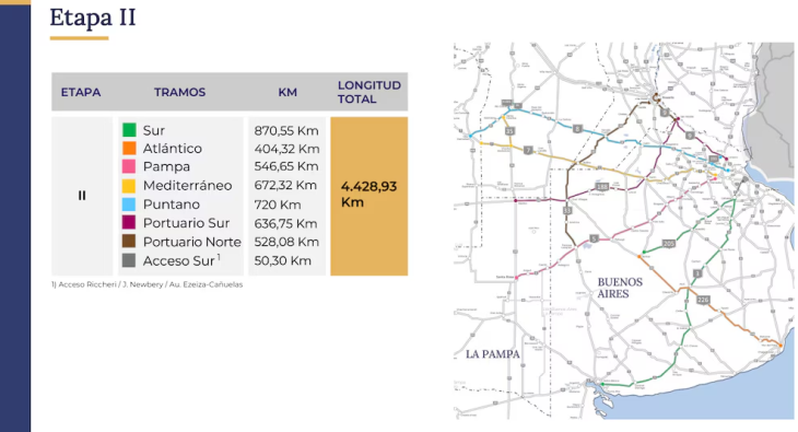 Esta Etapa II estará revestida de una complejidad mayor. Son ocho tramos en total, de extensiones variables, pero con una longitud total de 4.428,93 kilómetros. La mayoría de estas ya estaban en manos de Corredores Viales, sumando a otras que no orbitaban en esa empresa, como la Ruta Nacional 33 en Santa Fe y Buenos Aires, la Ruta Nacional 35 en Córdoba y la Ruta Nacional 188 en Buenos Aires y La Pampa.