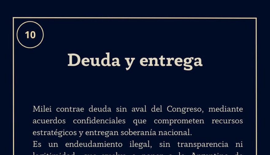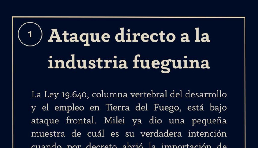 Finalmente, el referente peronista enfatiza la particular vulnerabilidad de la provincia más austral del país ante este modelo: "Si la situación nacional ya es crítica, desde Tierra del Fuego el panorama es todavía peor." Es en este marco que anuncia las diez razones específicas dirigidas a sus comprovincianos para rechazar la propuesta electoral de LLA.