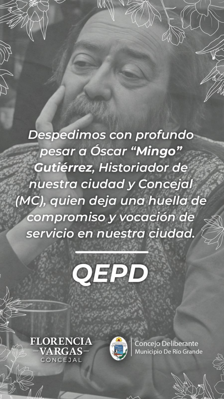 El Cuerpo de Concejales despide con profundo pesar a Oscar “Mingo” Gutiérrez, periodista, historiador, docente, concejal (MC) y figura entrañable de la vida cultural y política fueguina.