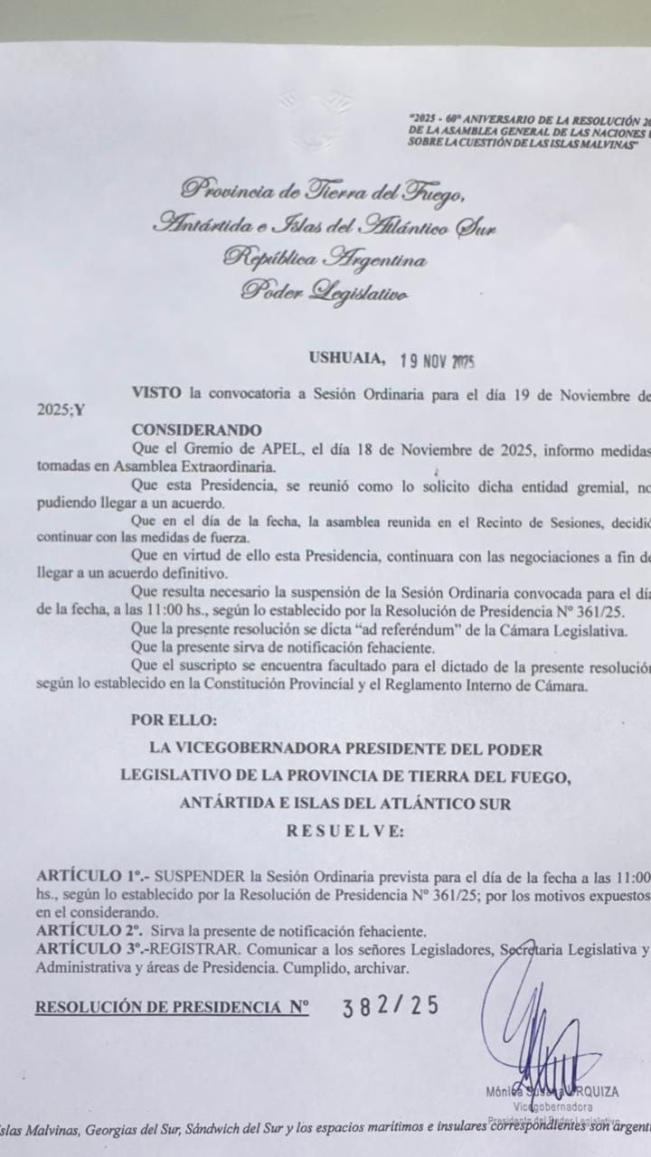 La resolución, identificada como Presidencia N° 382/25, detalla que el martes 18 de noviembre APEL comunicó formalmente las acciones sindicales y que, ante ese escenario, Urquiza mantuvo reuniones con representantes gremiales en un intento de destrabar el conflicto. Sin embargo, no se alcanzó un acuerdo.