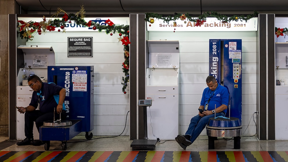 Trabajadores esperan en el aeropuerto internacional Simón Bolívar, en Maiquetía, Venezuela