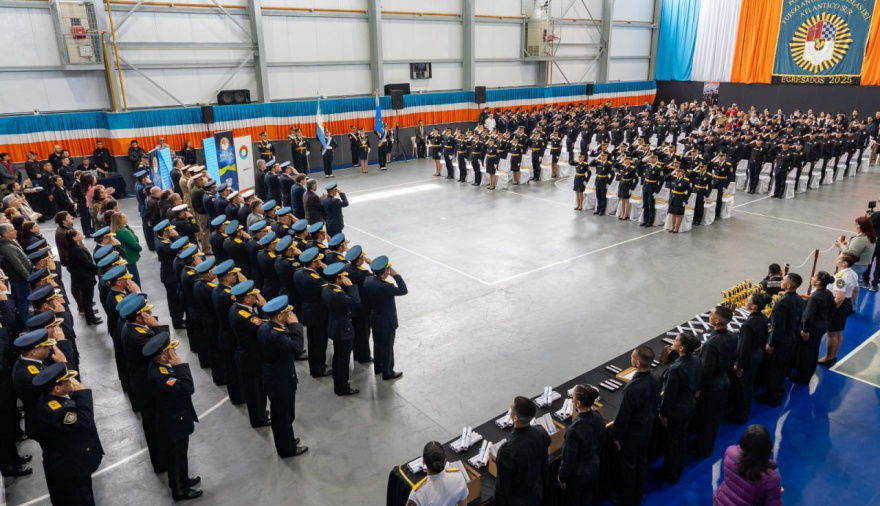 El Gobernador Gustavo Melella encabezó este lunes la ceremonia de egreso de la vigésimo sexta promoción de oficiales ayudantes y quincuagésima octava promoción de agentes de Policía de la Provincia, realizada este lunes en la ciudad de Río Grande.