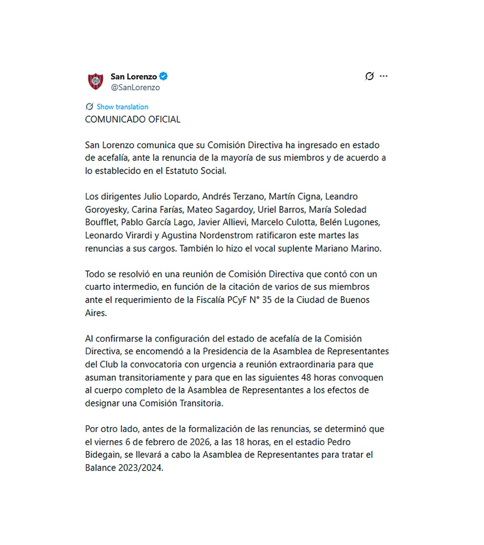 “San Lorenzo comunica que su Comisión Directiva ha ingresado en estado de acefalía, ante la renuncia de la mayoría de sus miembros y de acuerdo a lo establecido en el Estatuto Social. Los dirigentes Julio Lopardo, Andrés Terzano, Martín Cigna, Leandro Goroyesky, Carina Farías, Mateo Sagardoy, Uriel Barros, María Soledad Boufflet, Pablo García Lago, Javier Allievi, Marcelo Culotta, Belén Lugones, Leonardo Virardi y Agustina Nordenstrom ratificaron este martes las renuncias a sus cargos. También lo hizo el vocal suplente Mariano Marino”, indicó el club en un comunicado que difundió por redes sociales.