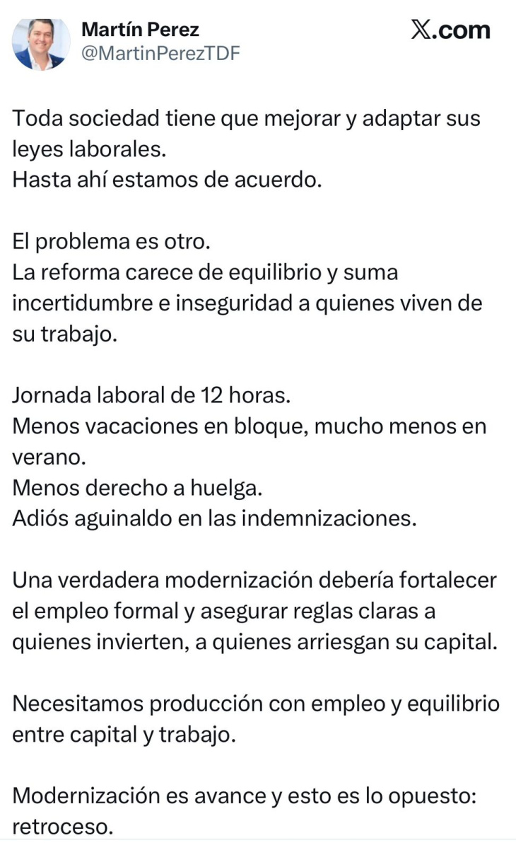La reforma, aprobada con 42 votos a favor y 30 en contra, ha generado críticas de distintos sectores, incluyendo al jefe comunal de Río Grande. A través de su cuenta en la red social X, Perez manifestó su preocupación por las consecuencias de la medida, destacando que "toda sociedad tiene que mejorar y adaptar sus leyes laborales", pero enfatizó que "el problema es otro: la reforma carece de equilibrio y suma incertidumbre e inseguridad a quienes viven de su trabajo".