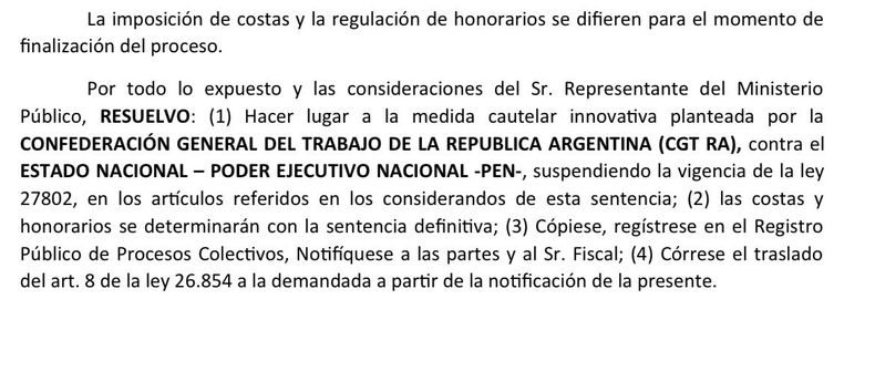 Además, Ojeda remarcó que la medida es provisoria y busca evitar consecuencias graves mientras avanza el proceso judicial. Las costas y honorarios se definirán en la sentencia definitiva, mientras que el Gobierno deberá responder en el marco del expediente abierto.